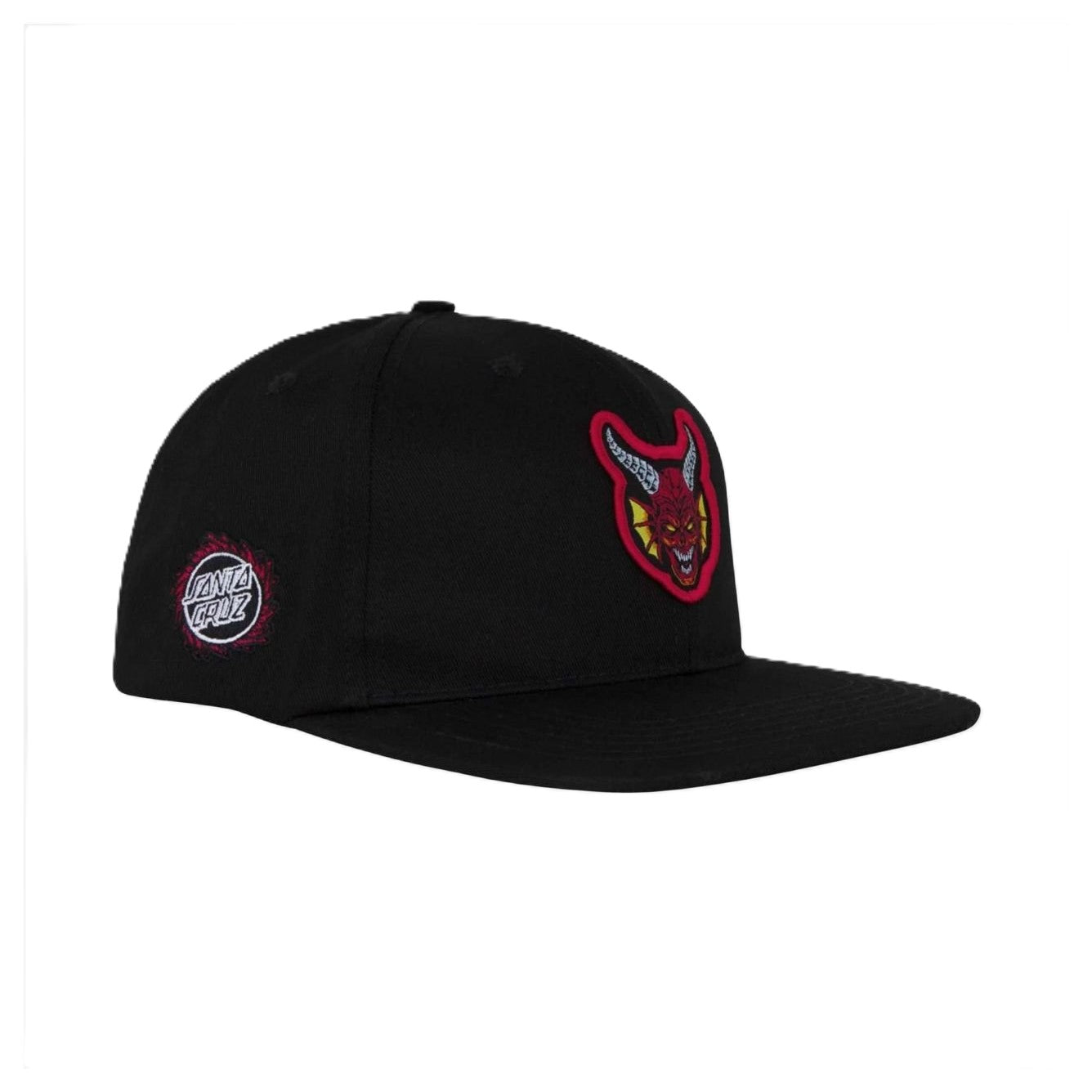 The Santa Cruz Stranger Things Hellfire Club unisex, mid-profile fit structured 6 panel twill snapback hat features front merrowed edge patch, direct embroidery on the side and back panels, sweatband label and custom interior taping.