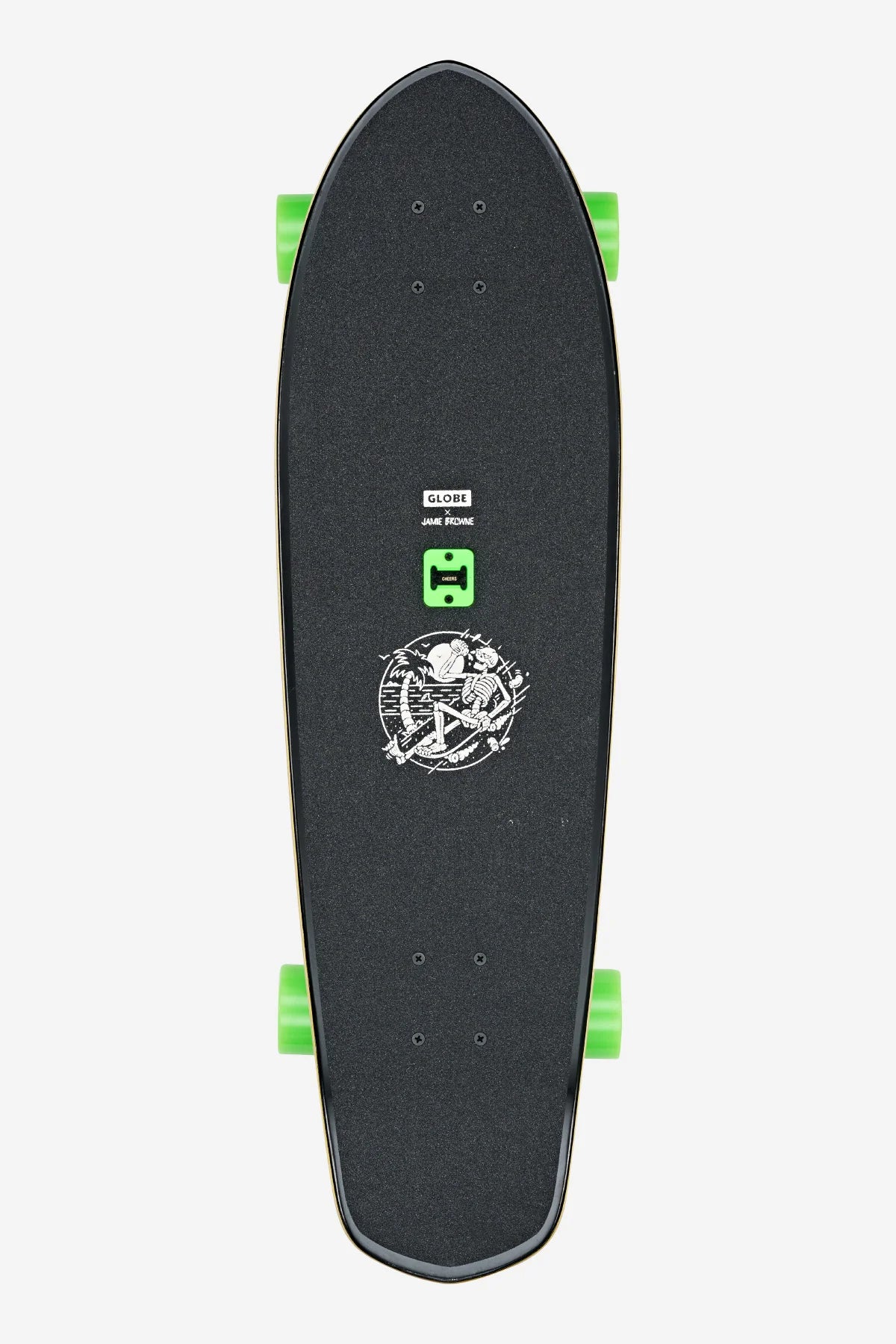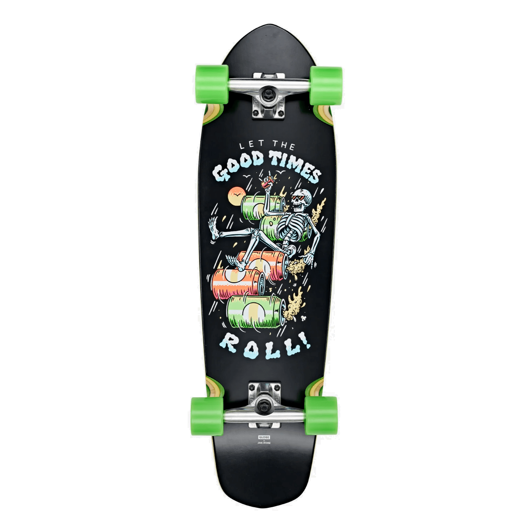 Medium length diamond-tail cruiser with soft conical wheels and built-in bottle opener, The Big Blazer - Good Times Roll Cruiserboard is constructed from Resin-7 with a mellow concave with kicktail. Features neon ink graphics from artist Jamie Browne.
